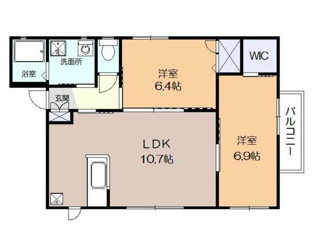 | 間取 | 2LDK (洋室6.9帖、洋室6.4帖、LDK10.7帖) | ||