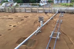 給排水管の下にクロスしている溝は大昔の排水溝でしょうか 左側には柱が建っていたようなのような丸い跡があります。平塚東真土計画道路内埋蔵文化財包蔵地にて