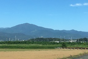 田園の向うに青空のもと山並が続いています。 北豊田にて