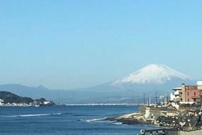 晴天の海に浮かぶ富士山と江ノ島です。稲村ガ崎にて