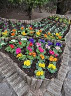 お寺の花壇は野菜畑のように手入れが行き届いています。冬の花が満開です。