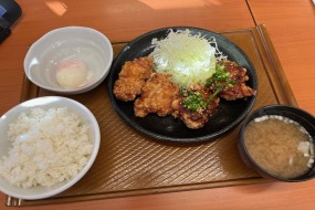 唐揚げ定食を美味しくいただきました。温泉卵付きです。