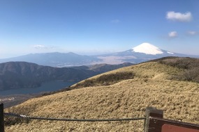 標高1300m強、箱根ロープウェイで登った先 駒ヶ岳から富士山を望む 風がとっても強かったですが、景色が圧巻の一言につきます。 芦ノ湖もいっしょにみえました。