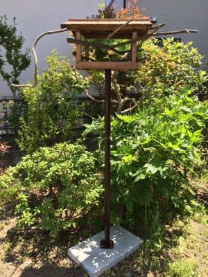 鳥のエサ台を作りました。 警戒してか、しばらくは来ませんでしたが、 勇気のある雀1羽がきてから次々と来るようになり、食べ終わった後は枝にとまり休んでいくようになりました。