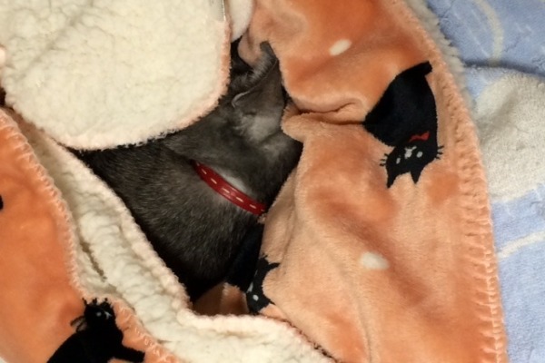毛布の中で寝ています。 全然起きません。もう、外の暮らしはできません。
