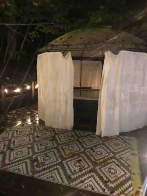 どしゃ降りの雨の中、グランピングにきました。ジャグジー付きのテント泊。。。一体どうやって入ったら良いのかわからない状態です。