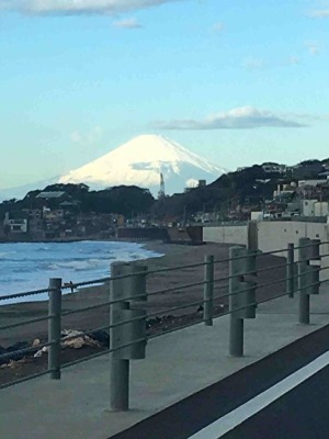 頂上から煙りがスーとたなびくような雲がかかっています。 134号線鎌倉高校前にて
