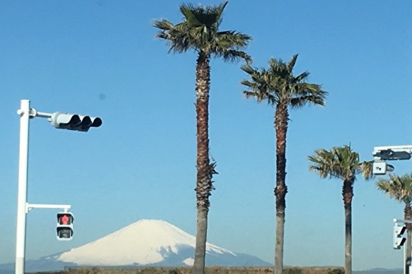 青空に映える春の富士山と南の島の信号コラボです。134号線江ノ島水族館前にて