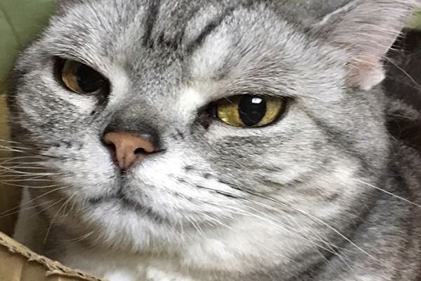 今日もお気に入りのユニクロの段ボール箱に入っています。カメラ目線のすまし顔です。