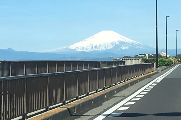 平成最後、四月の寒気で冠雪しています。134号線七里ヶ浜の行合橋付近から
