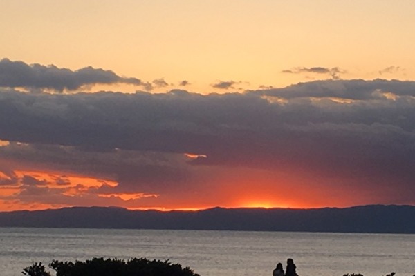 伊豆半島に落ちる夕陽が雲を茜色に染めています。七里ヶ浜から望む秋の落日です。