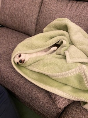 のびのび〜 ん? 布団に何かいるぞ〜 っと思ったら うちのワンチャンでした。
