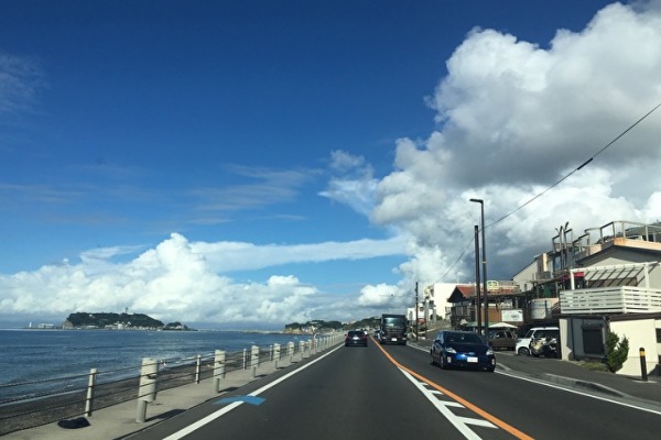 青空に入道雲が大きく育っています。七里ヶ浜にて