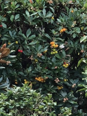 鳥が、赤く熟した実を食べに来ます。イチゴの木です。