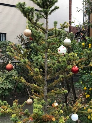 庭にある、モミの木に孫達が飾りをつけました。そろそろ孫達へのクリスマスプレゼントを用意する時期となりました。