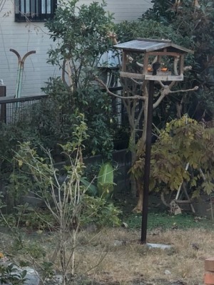 庭の餌台にミカンを刺しておいたら、鳥が食べにきました。