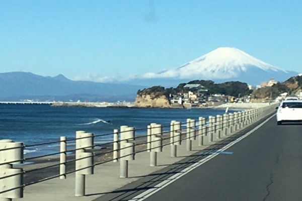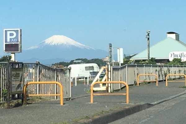 雪が半分とけて春の富士山です。七里ヶ浜駐車場にて