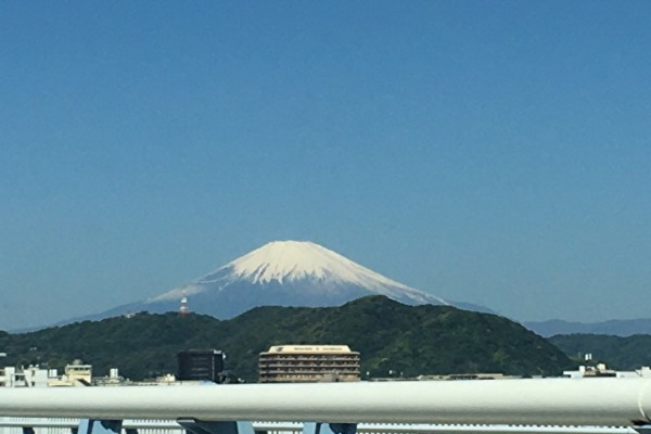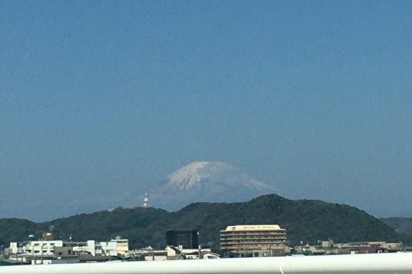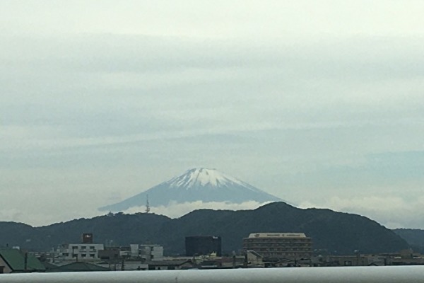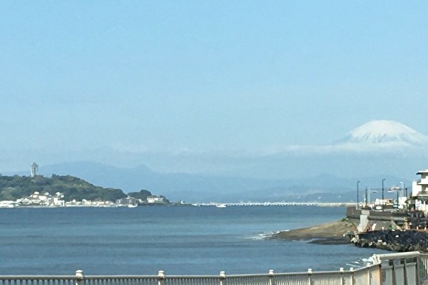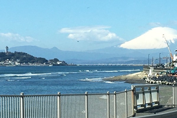 江ノ島の向こうの富士山が雲に浮かんでいます。