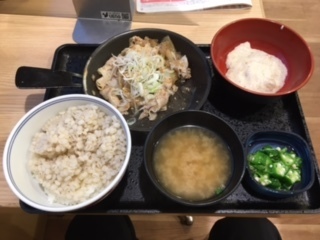吉野家のねぎ塩豚麦とろをおいしくいただきました。