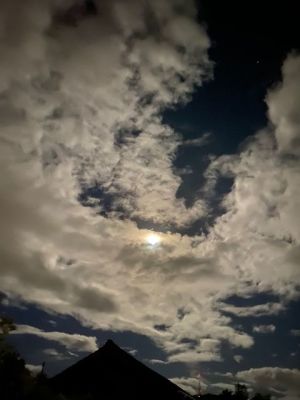 夜リフレッシュ散歩をしていたら、、 なんだか明るくて。 見上げた空には満月が。 雲も多いけれど、それもまた神秘的な雰囲気を演出していました。