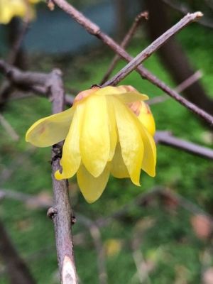 庭のロウバイが咲いています。もうそろそろ終わりです。蝋でできた様な花です。