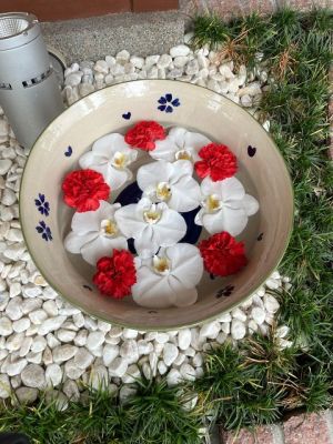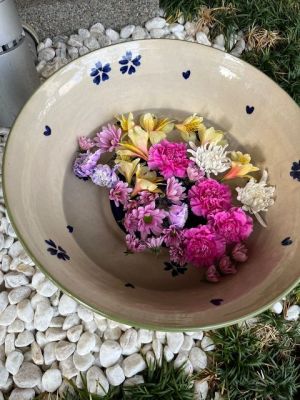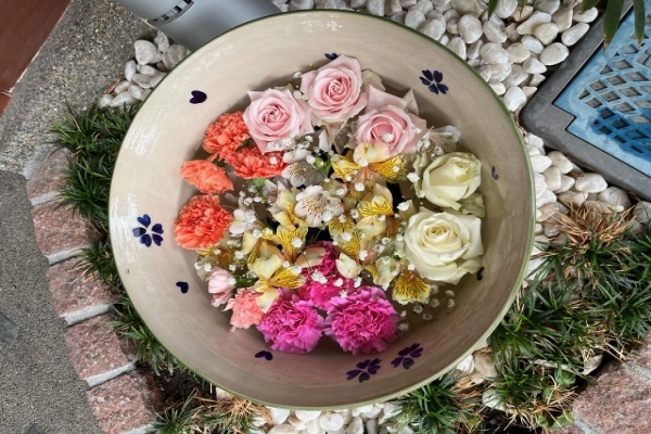 ピンクとイエローのコンビネーションが爽やかです。花少なめの花手水です。