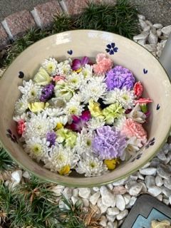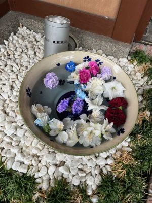 ラベンダーが華やかに グリーンを引き立てています。明石町花手水です。