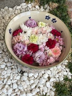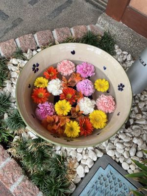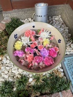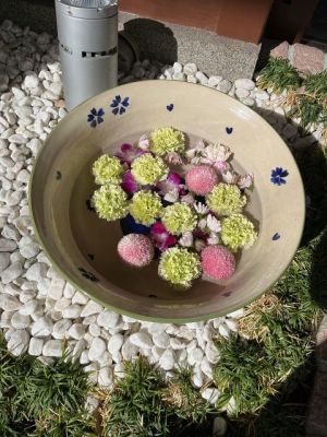 ペパーミントグリーンとピンクがアクセントになっています。淡い感じの花手水です。