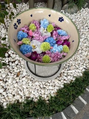 水色とペパーミントグリーンがコラボして明るい雰囲気の花手水です。