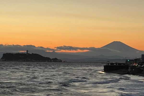 富士山と江の島の冬の落日です。稲村が崎公園にて