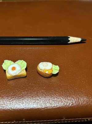 粘土でオープンサンドウィッチ 朝食べたオープンサンドウィッチを見て、制作意欲が湧いたようです。 とても細かい作業で レタスのシワ パンの質感 レジンを使った目玉焼き表面の光沢 薄皮がある目玉焼き トマトのカラー 小学生の能力に驚きです。