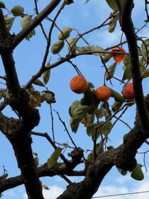 庭の柿が、だんだん熟してきたので、鳥が食べに来ます。