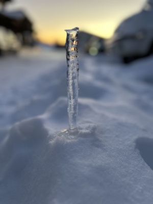 長野戸隠スキー場で、マイナス7度の夜を体験 そして車のタイヤ付近に見事なつららを発見。 パキッと折って雪に乗せてパチリ なんだか良い雰囲気の写真になりました