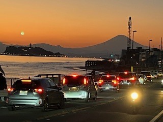 茜色の中に富士山と江ノ島のシルエット